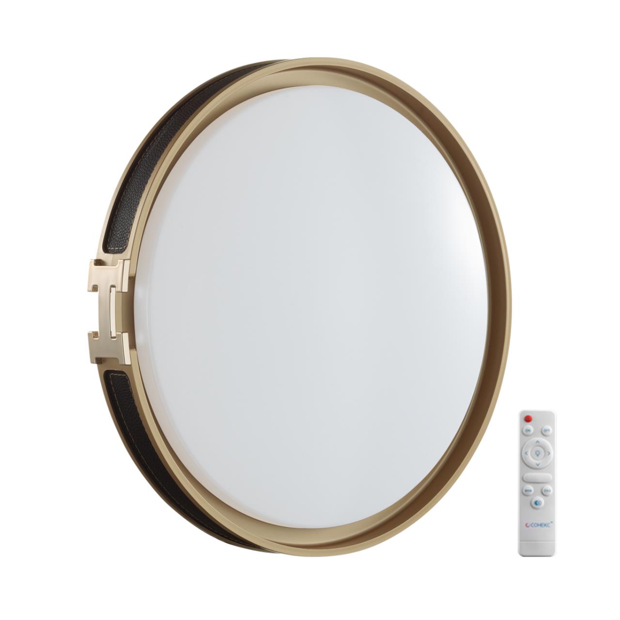 Светильник 7667/EL линии FAVEMO BLACK состоит из металлического основания (базы) и пластикового рассеивателя. Материал рассеивателя - высококачественный пластик марки PMMA 2.0 белого цвета с матовой поверхностью. Пластик обеспечивает светильнику равномерное рассеивание и хорошее светопропускание. Форма плафона: круглая, декорирована ободом из искусственной кожи черного цвета. Обод украшен декоративной вставкой в виде пряжки ремня из пластика, цвет золото. Степень защиты IP43 позволяет использовать светильник в определенных зонах влажных помещений. В комплект входит заменяемый LED модуль с линзами, мощностью 70Вт, которая соответствует лампе накаливания 610Вт. А также пульт ДУ (с креплением на стену), с помощью которого осуществляется плавное изменение цветовой температуры 3000-6000К, изменение яркости, переход в режим переключения теплого/белого/холодного/ночного света. Светильник имеет функцию "память".
