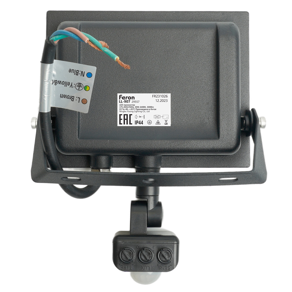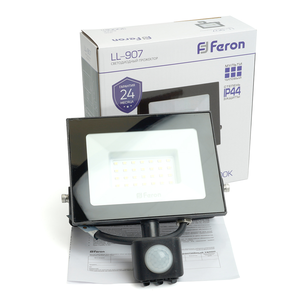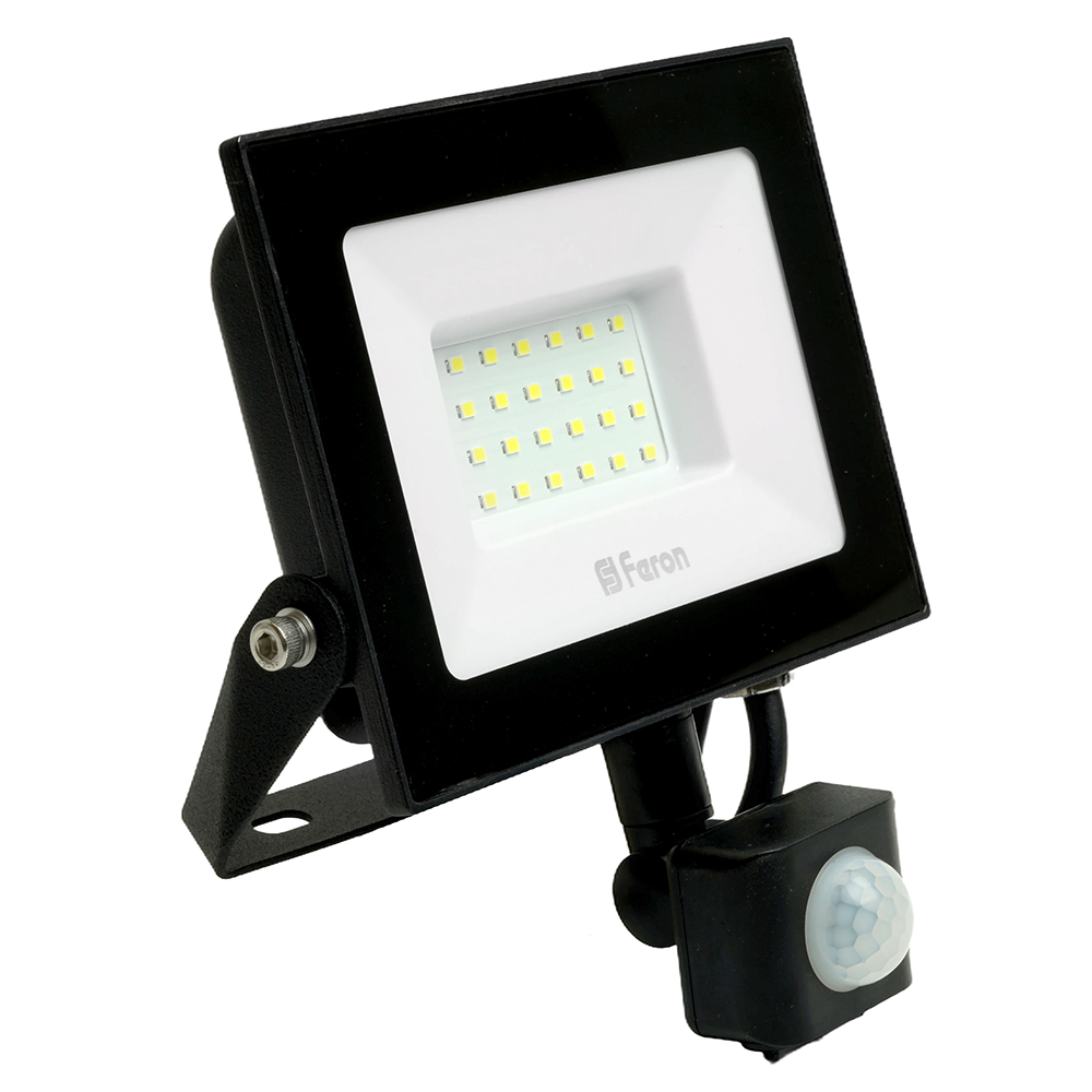 Прожектор светодиодный многоматричный с монтажным креплением на кронштейн, с инфракрасным датчиком движения (ДО) FERON LL-907, 30W, 6400К (холодный белый), 175-265V/50Гц, 3000Lm, IP44, угол рассеивания 120°,*SMD2835, раб.t -40°C - +45°C, цвет черный, корпус алюминий литой под давлением + стекло, 164*167*79 мм
