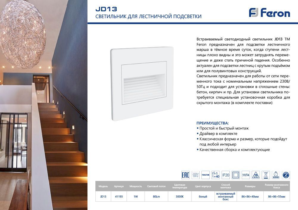 Светильник встраиваемый светодиодный, для лестничной подсветки (ДВО) FERON LN13/JD13, 1W 3000К (белый), 230V, 80Lm, IP20, цвет белый, корпус пластик ABS, рассеиватель матовый акриловый полимер, 40*86*86 мм, монтажн.отв. 86 мм.