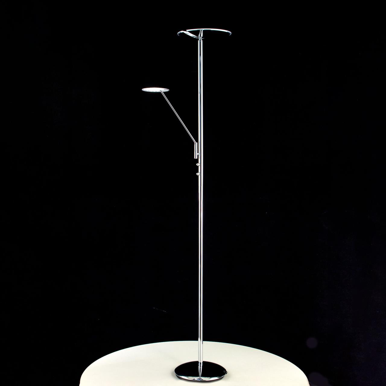 Торшер высотой 180 см с двумя регулируемыми по направлению светодиодными головами, диаметр основания 28см, потолочная голова D=28см с литым корпусом, мощностью18Вт с диммером 20-100%; голова для чтения D=13.5 см с литым корпусом, мощность 5 Вт с диммером