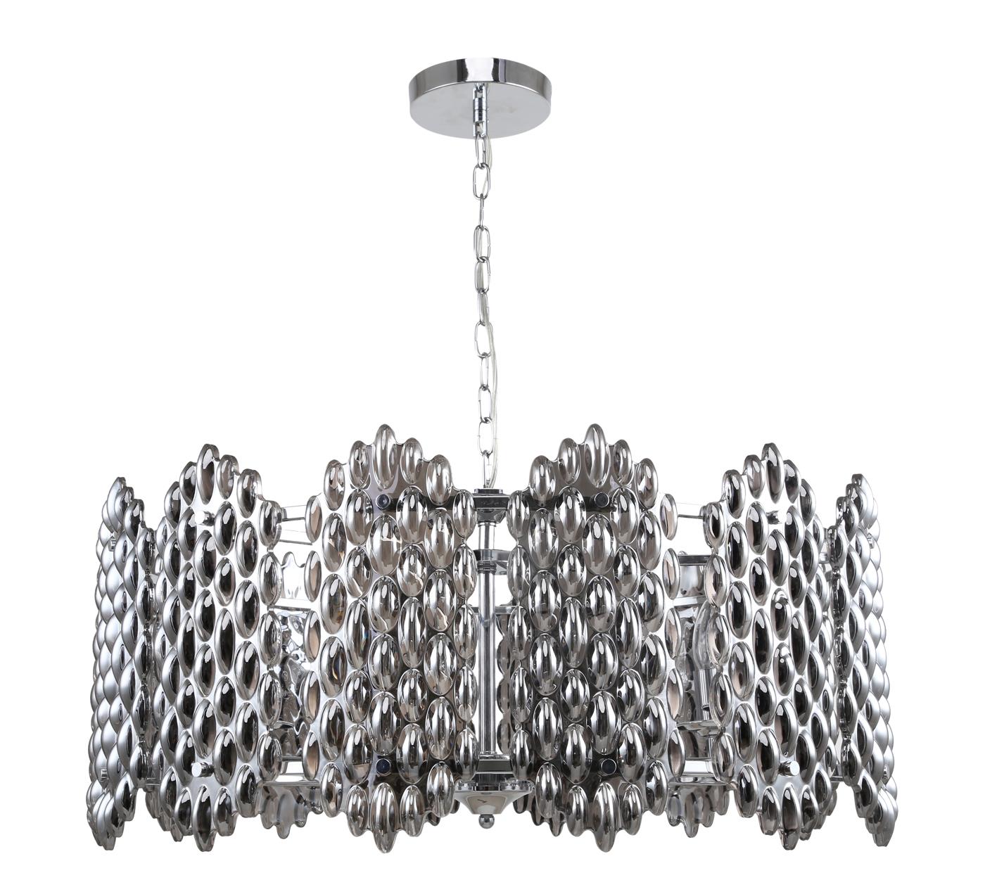 Люстра подвесная из коллекции Glazgo / Глазго выполнена из металла, гальванизированного в цвет хрома, и декорирована вертикальными фактурными стеклами дымчатого цвета.