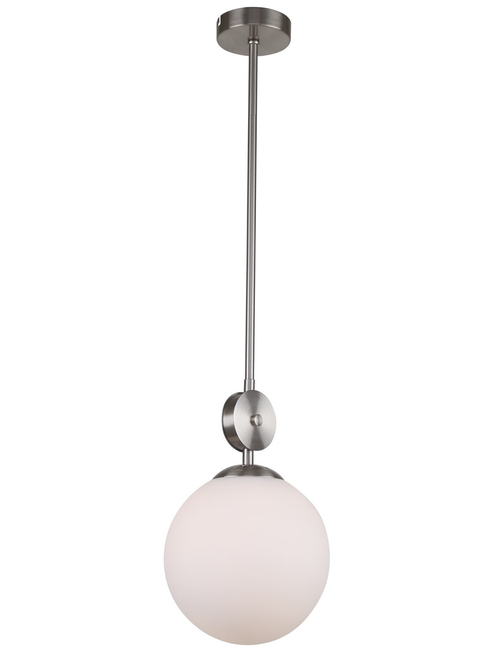 Светильник подвесной на штанге из коллекции Marsela / Марсела выполнен из металла, гальванизированного в цвет никеля, и декорирован белым стеклянным матовым плафоном, а также металлическим медальоном, гальванизированным в цвет арматуры. Премиальное качество и неповторимыи? дизаи?н светильников идеально подои?дут как в классические, так и современные интерьеры.