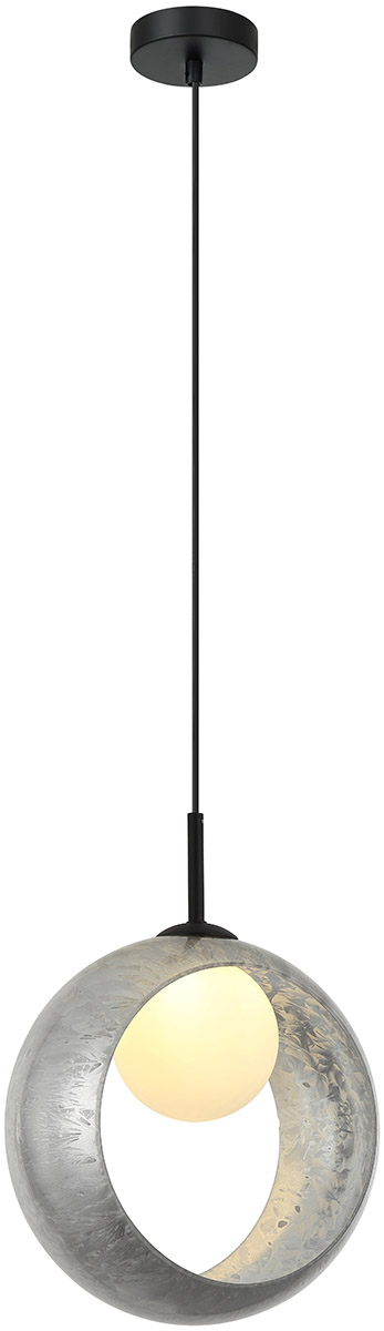 Светильник подвесной коллекциии Raundi / Раунди выполнен из металла, окрашенного в черный цве,т и декорирован двумя стеклянными плафономи. Белый матовый плафон из стекла в форме сферы и декоративный стеклянный плафон в виде кольца окрашен в серебристый цвет. Индивидуальный рисунок ручной работы, имитирующий узоры инея, придаёт коллекции эксклюзивность. Премиальное качество и неповторимыи? дизаи?н светильников идеально подои?дут в современные и дизайнерские интерьеры.