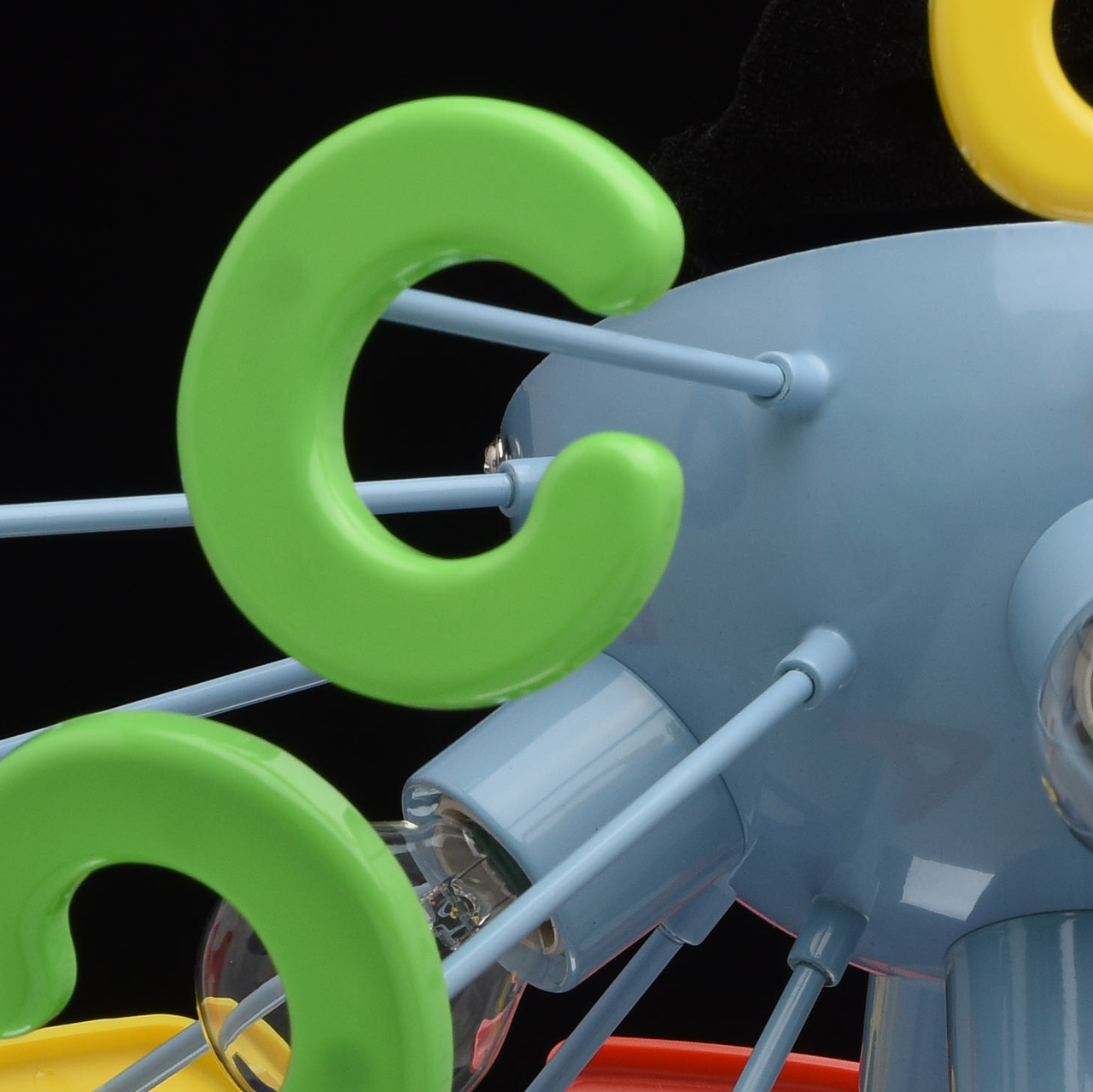 Эта яркая и необычная люстра из коллекции «Улыбка»  станет отличным дополнением любой детской комнаты. Её радужный, цветной дизайн всегда будет вносить в обстановку ребяческую непосредственность и беззаботность. Основание люстры выполнено из окрашенного металла и удачно сочетается с абажуром в виде красочных разноцветных букв, изготовленных из высококачественного пластика. Такая люстра станет источником не только света, но и позитива! Рекомендуемая площадь освещения порядка 10 кв.м.